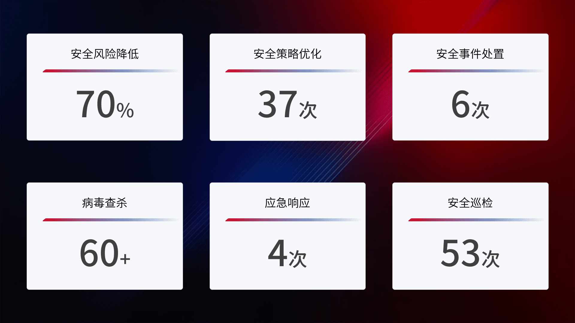 提供全面的安全事件报告体系,,包括处置报告、、周报、、、、季度和年度总结,,,,结合持续监控,,,,帮助客户深入了解网络安全状况。。。