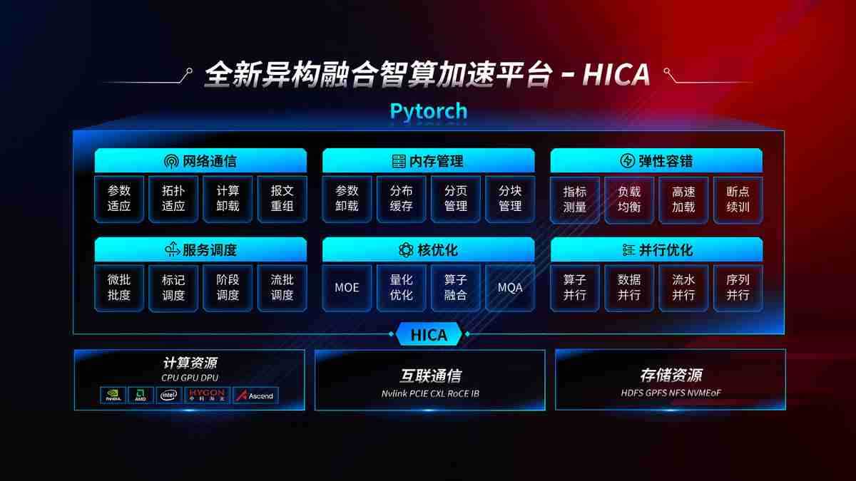 通过自研的服务层、、中间适配层、、、以及调度编排算法,,采用数据并行、、模型并行等多种并行方式,,把并行计算任务进行有效的分解,,,,使其分别由相应的软件栈和算力资源来承接。。。。当GPU资源变化,,HICA可以实时动态调度计算子任务并调整模型拓扑和架构,,,,以充分聚合各种算力资源。。