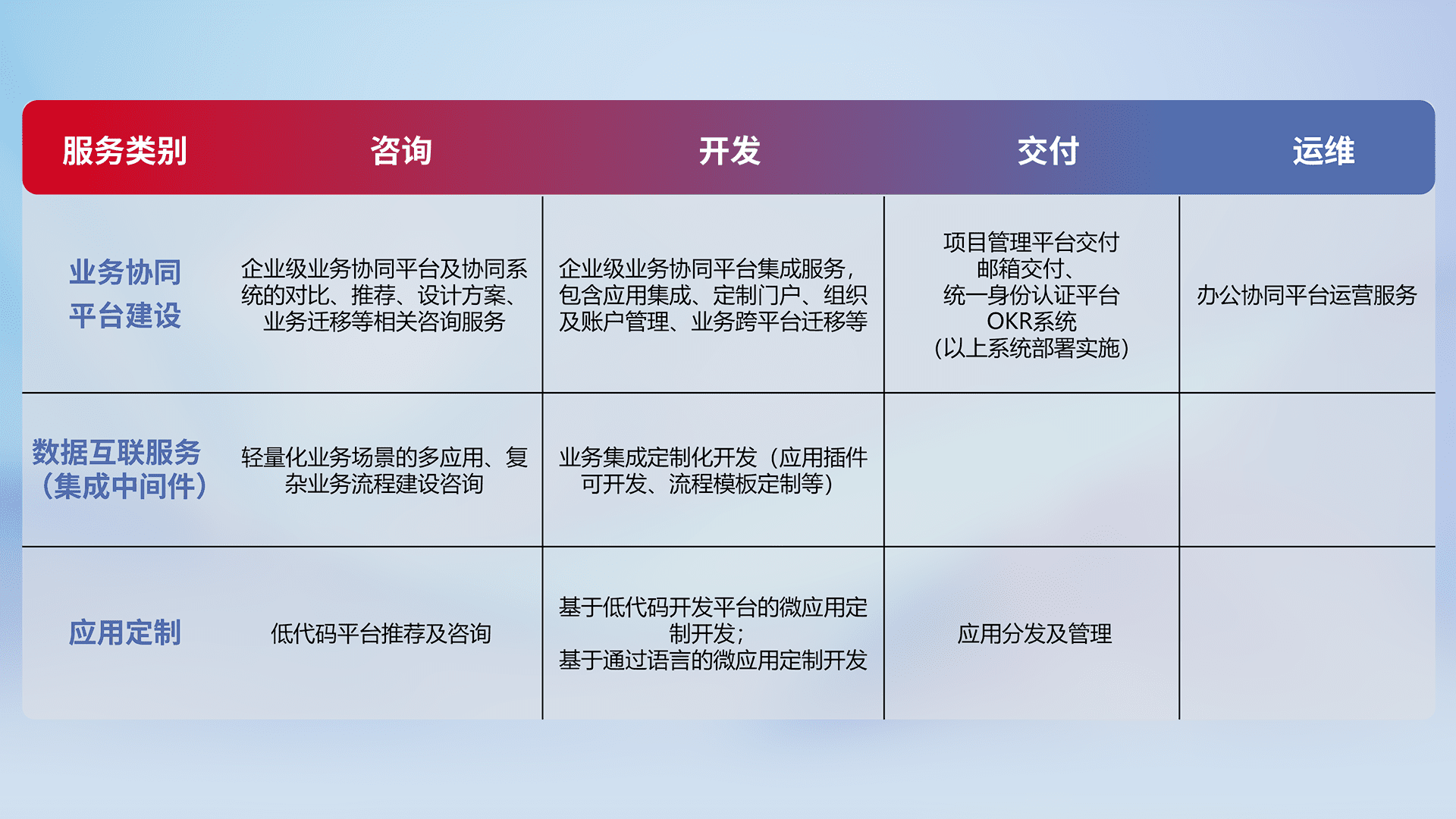 针对钉钉、、、企微、、IDaas等平台级产品提供产品的规划、、方案、、、交付、、定制化开发等服务,,,实现如统一协同办公、、智能客户服务、、混合会议管理、、、智能数据查询、、等业务场景,,,实现数字化转型。。。。